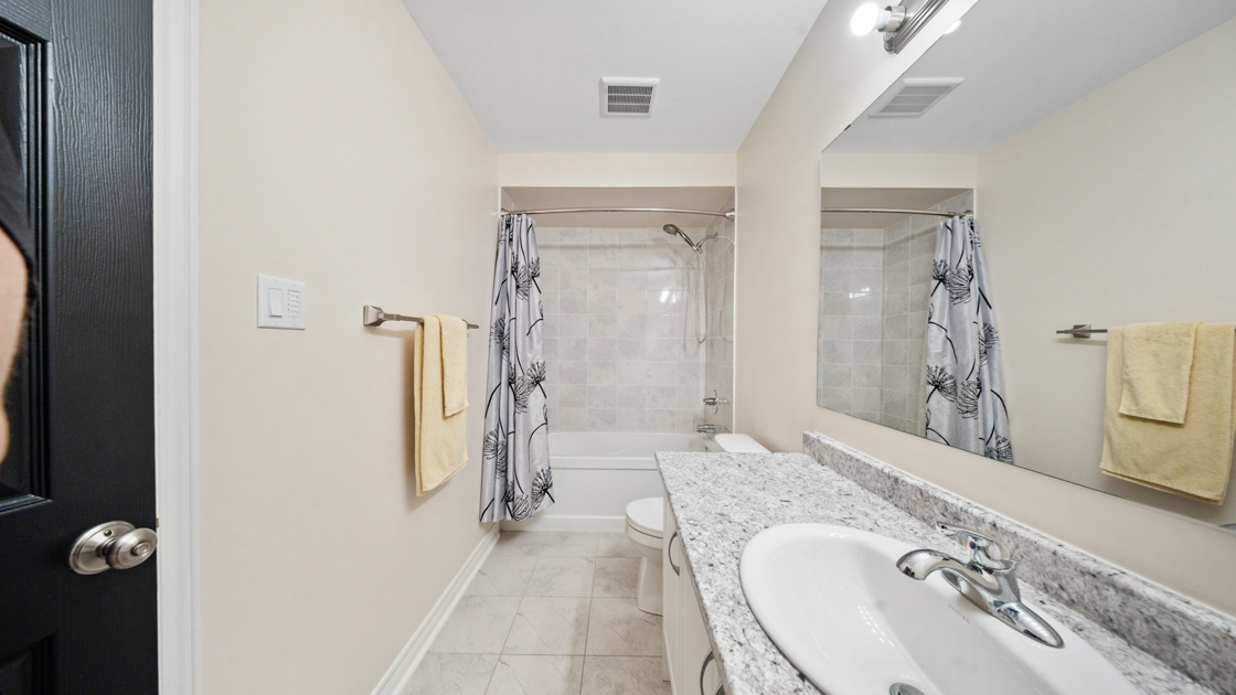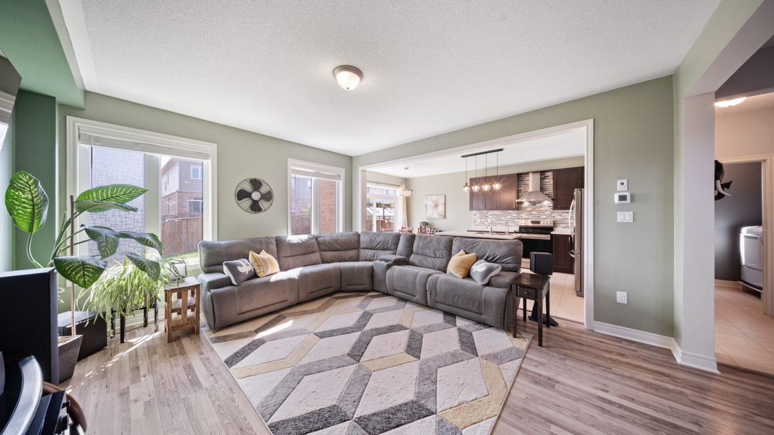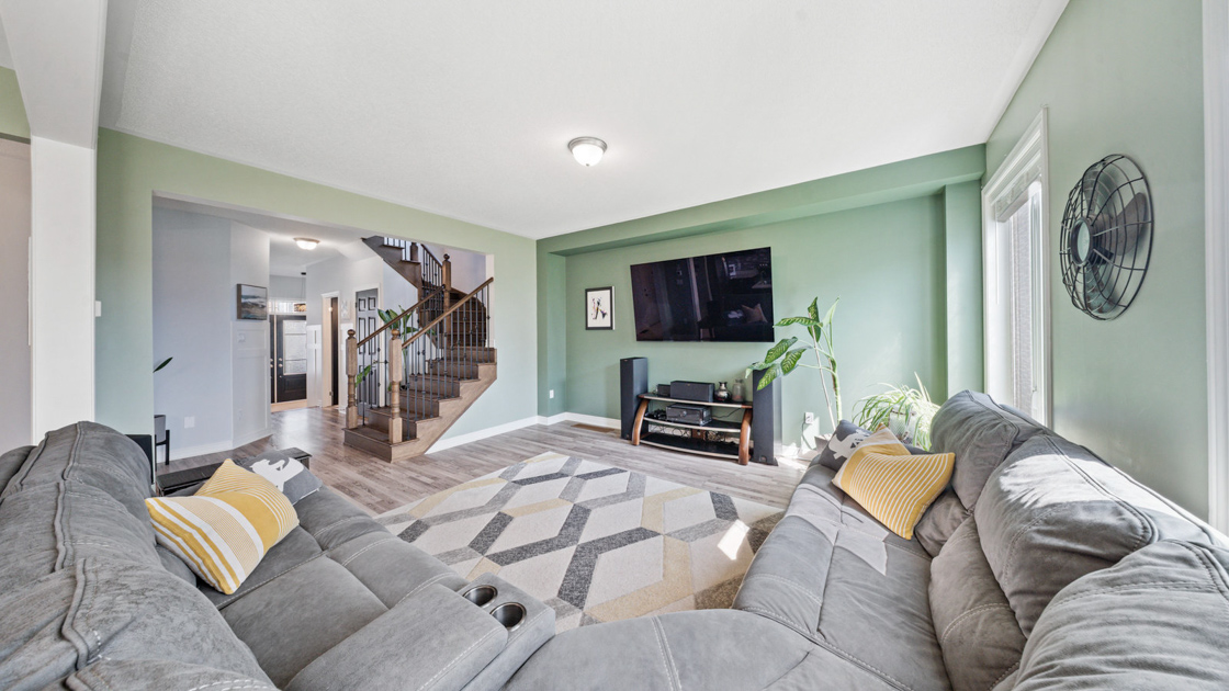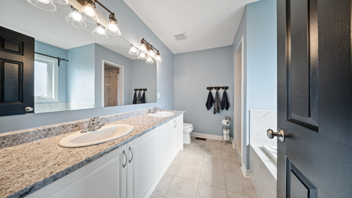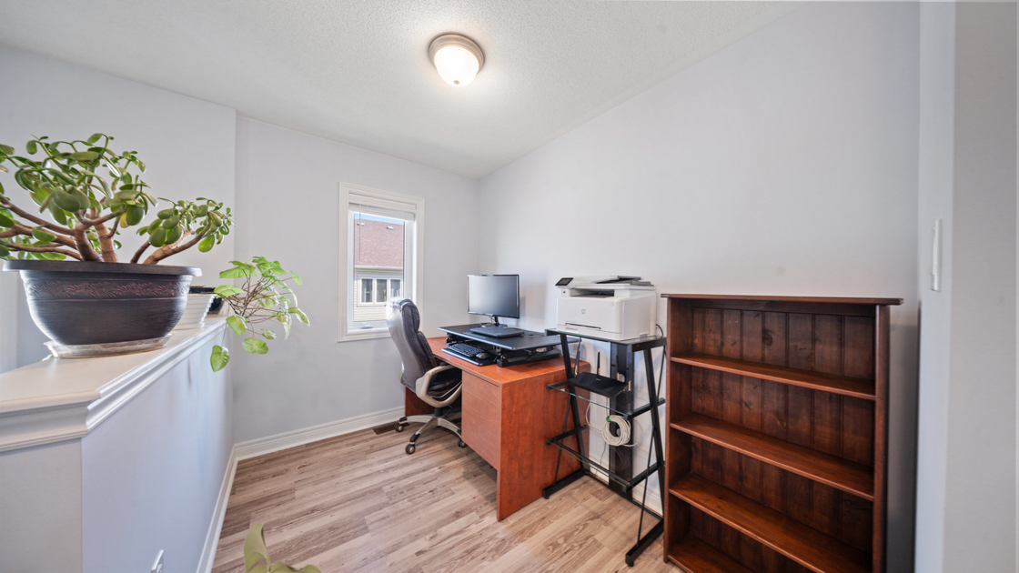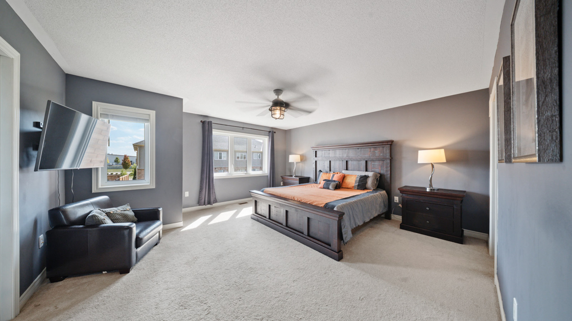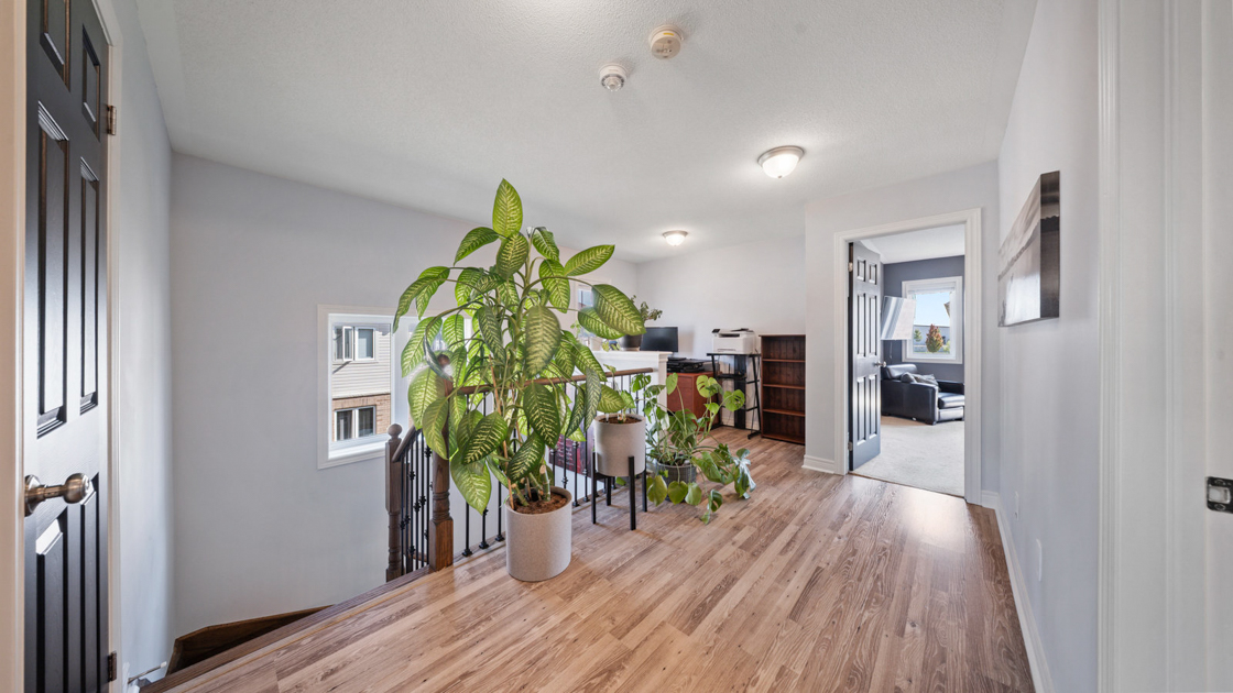 Upstairs, a large landing offers a versatile den space—ideal for a kids’ play area or home office. The primary suite, situated at the back of the home for added privacy, features a walk-in closet and spa-like ensuite with dual vanity, soaker tub, and walk-in shower. Two additional generously sized bedrooms and a 4-piece bathroom complete the second floor.