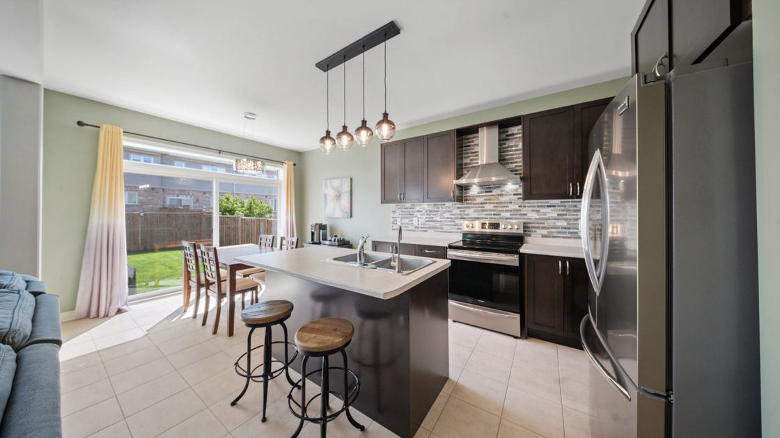 Step into the bright and inviting entryway, finished with wainscoting and a coat closet, and move into the open-concept main floor. The spacious living room flows seamlessly into the eat-in kitchen, complete with a center island, breakfast bar, shaker-style cabinetry, tiled backsplash, stainless steel appliances, and abundant counter and cupboard space. Oversized patio doors off the kitchen provide easy access to the backyard, perfect for entertaining. Also on the main level are a convenient 2-piece powder room and laundry.