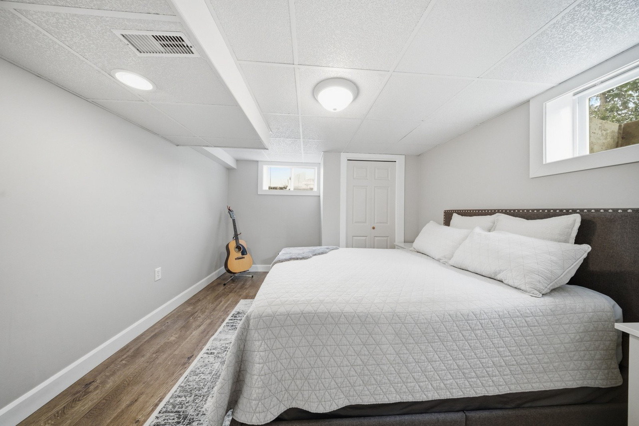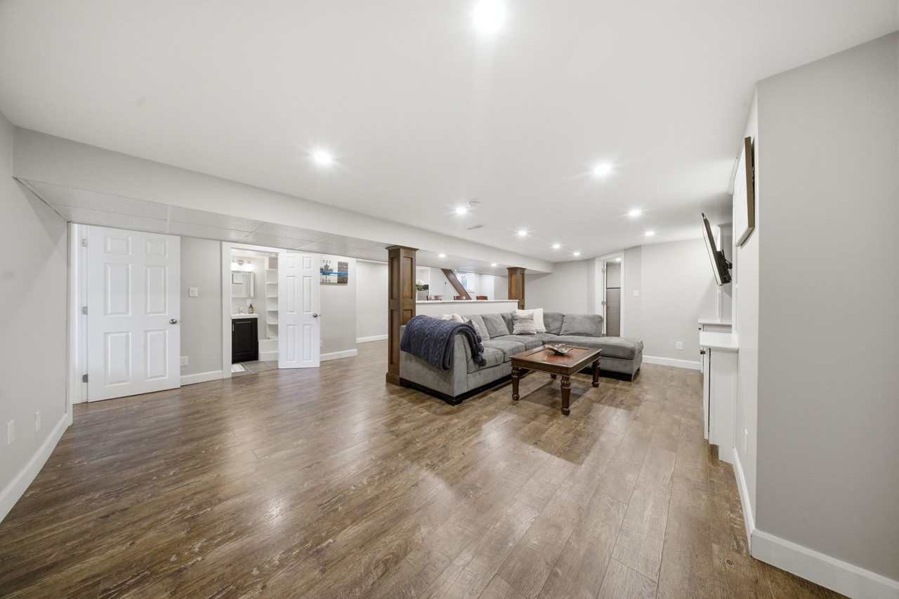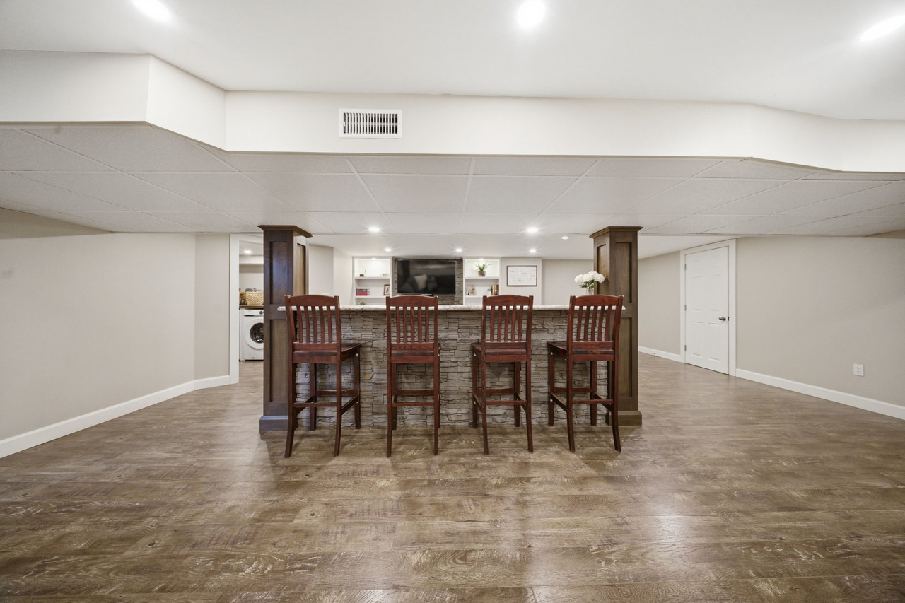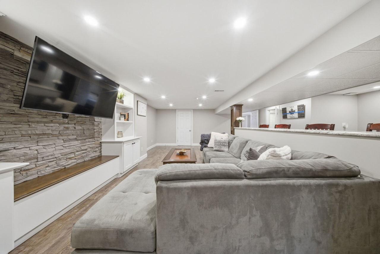 Looking for more space? The finished lower level provides even more room for the whole family to enjoy. A beautifully finished rec room features a built-in unit with a stone accent wall and TV viewing bar, making it the perfect spot for watching sports, hosting events, or simply relaxing. A rough-in for a wet bar adds even more potential for entertaining or creating your ideal hangout space. This level also includes a 3-piece bathroom, two additional large bedrooms, and a finished laundry room.