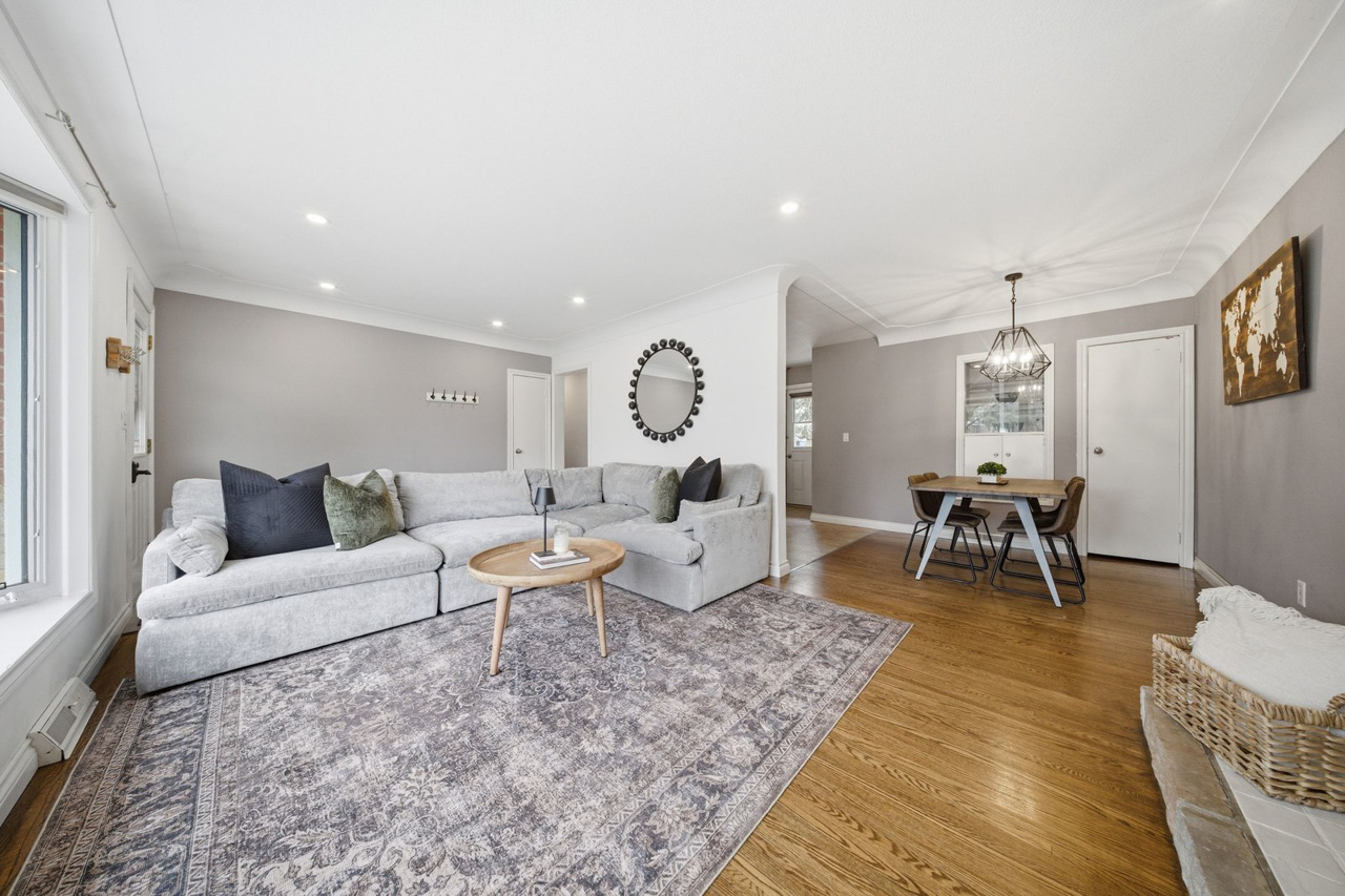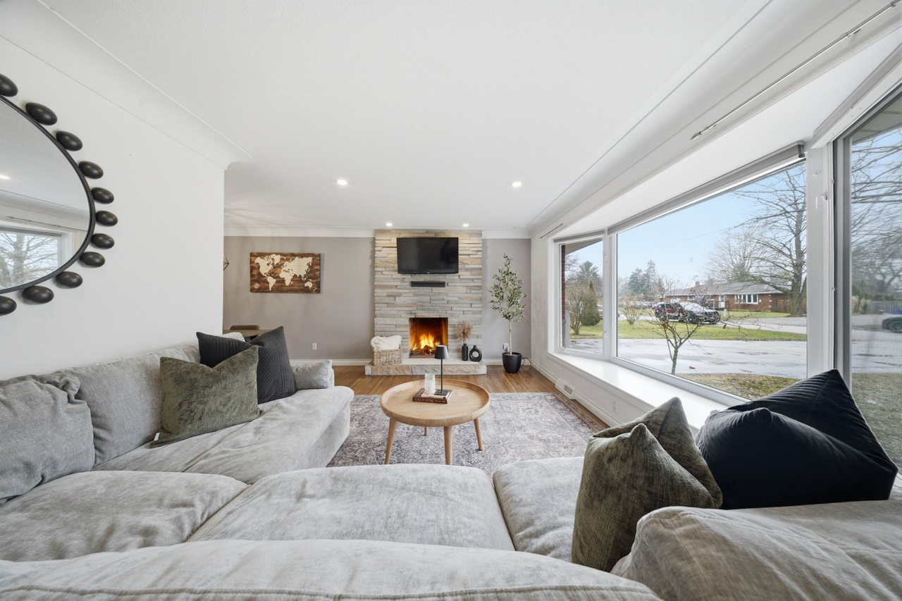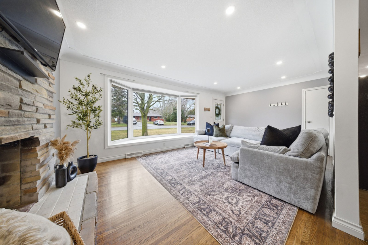 With its all-brick exterior, large driveway, and ample parking for multiple vehicles, this property is well suited for everyday living, entertaining, and family gatherings. Step inside to a bright and spacious living room featuring a beautiful bow window that fills the space with natural light. Refinished hardwood flooring flows through the living and dining areas, while recessed pot lighting and a stunning stone hearth add warmth and character. The main floor offers a great balance of open-concept living while still maintaining a cozy, inviting feel.