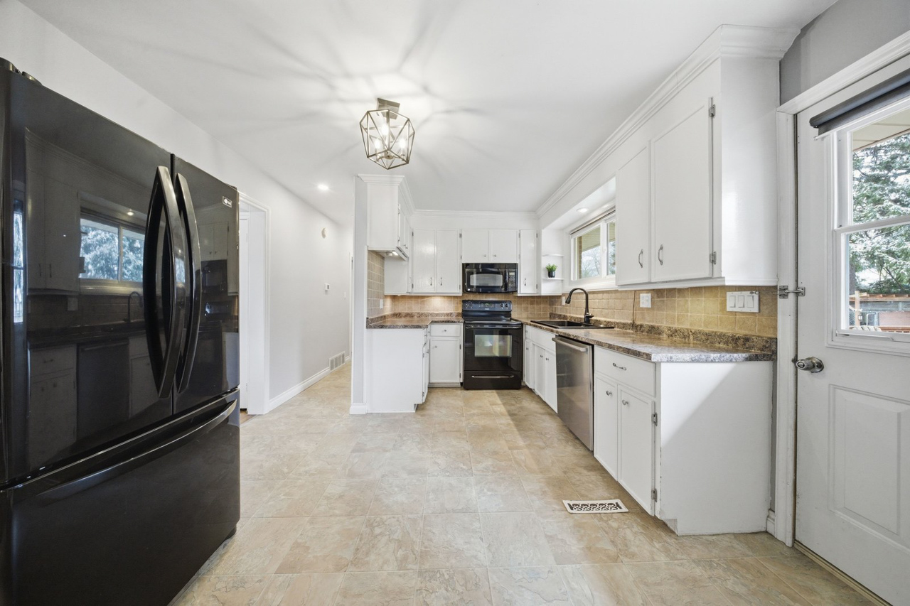 The spacious kitchen is designed with functionality in mind, offering plenty of cupboard and counter space, white cabinetry, tiled backsplash, and under-cabinet lighting. Convenient access to the backyard is located just off the kitchen, making outdoor entertaining easy.
