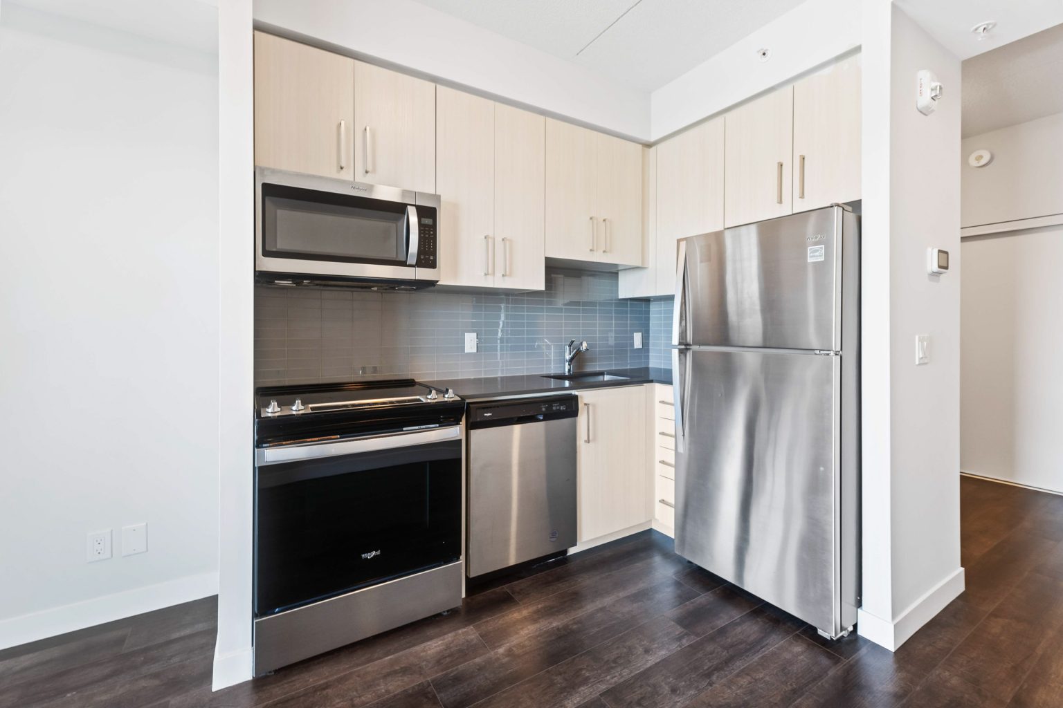 The condo features an open floor concept with a designated bedroom area. The bedroom area is distinguished yet seamlessly integrated into the open floor plan providing a comfortable and functional living environment. Enjoy the convenience of in-suite laundry, a 38-inch width hallway and a well-sized washroom with the luxury of a glass-enclosed walk-in shower, as well as neutral/dark tones throughout the unit, enhancing its modern appeal. Step out onto your private balcony to relax and enjoy the views throughout the year.