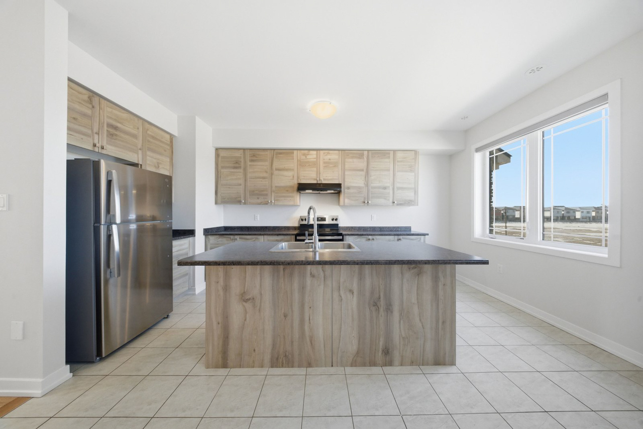Just down the hallway, you’ll find a 2-piece powder room and a spacious kitchen featuring tile flooring, ample counter and cupboard space, and a large island with dual sink. The layout also allows for a full-sized dining table, comfortably seating six – ideal for hosting family and friends.