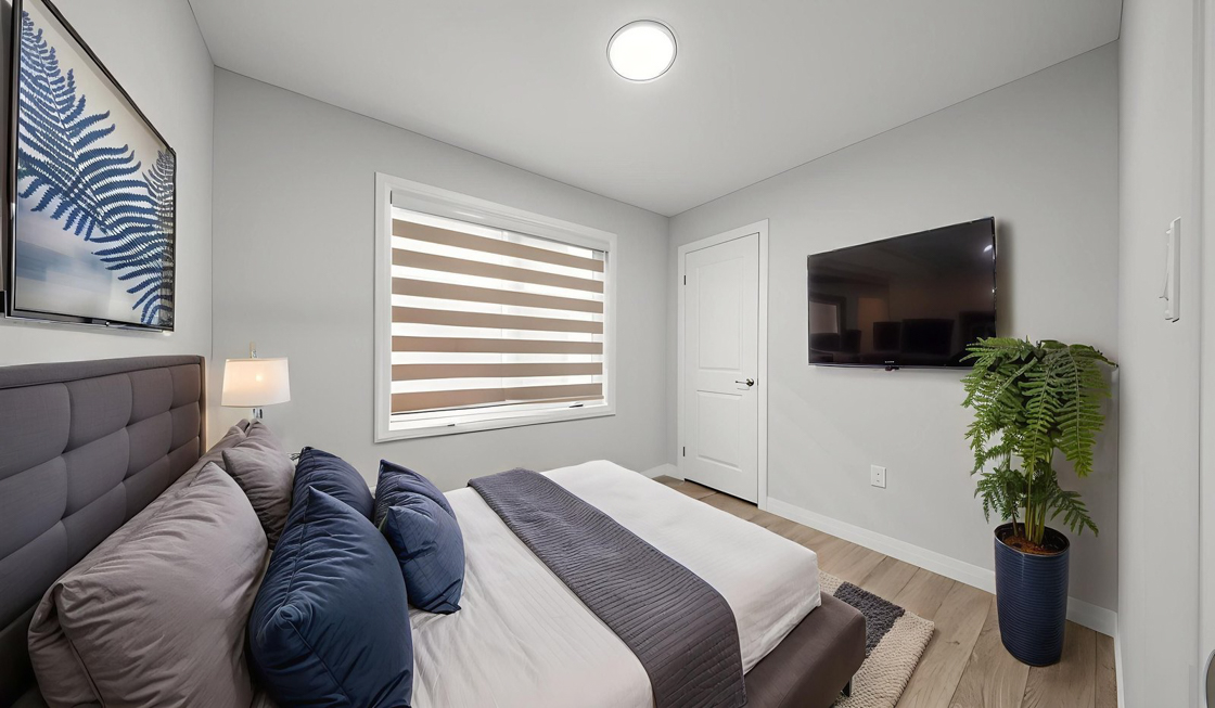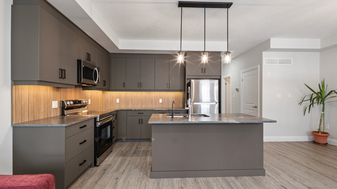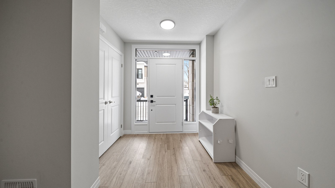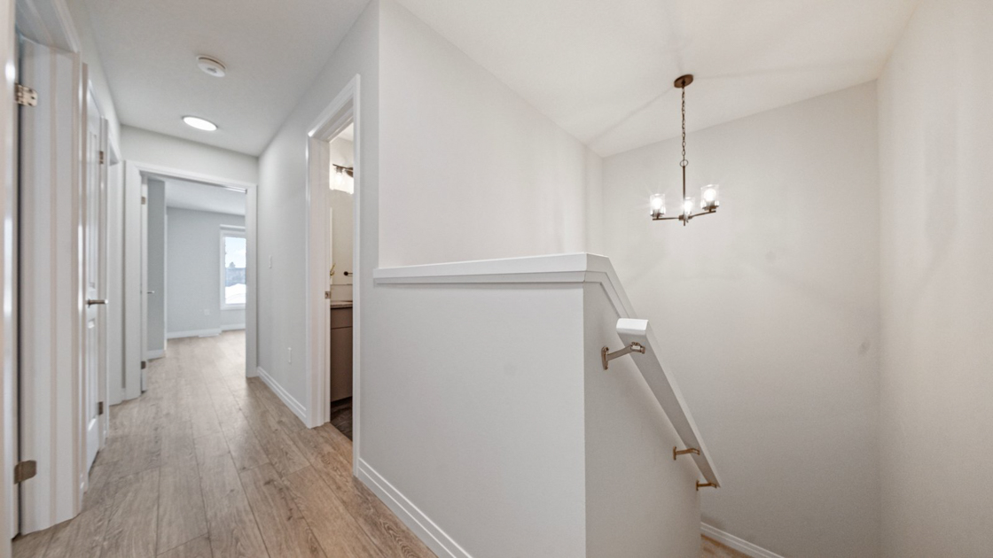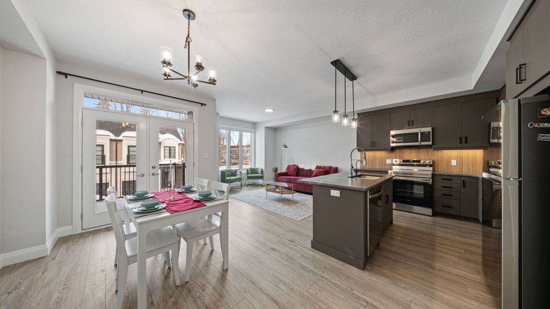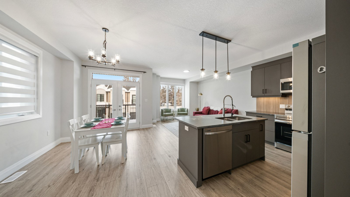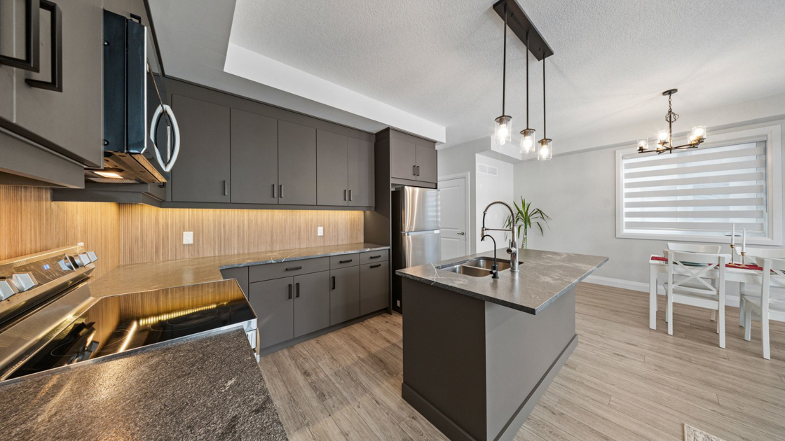Step into an expansive foyer and versatile den space, perfectly complemented by seamless interior access to the garage. Just a few steps up, the open-concept main level is designed for both daily living and entertaining. The stunning kitchen features stainless steel appliances, stylish backsplash, under-cabinet lighting, and ample counter space—perfect for those who love to cook. A large island provides seating for three, while the adjacent dining area easily accommodates a table for six. The kitchen flows seamlessly into the spacious living room, complete with French doors leading to a charming front walk-out Veranda. A convenient two-piece bathroom and laundry room completes this level.